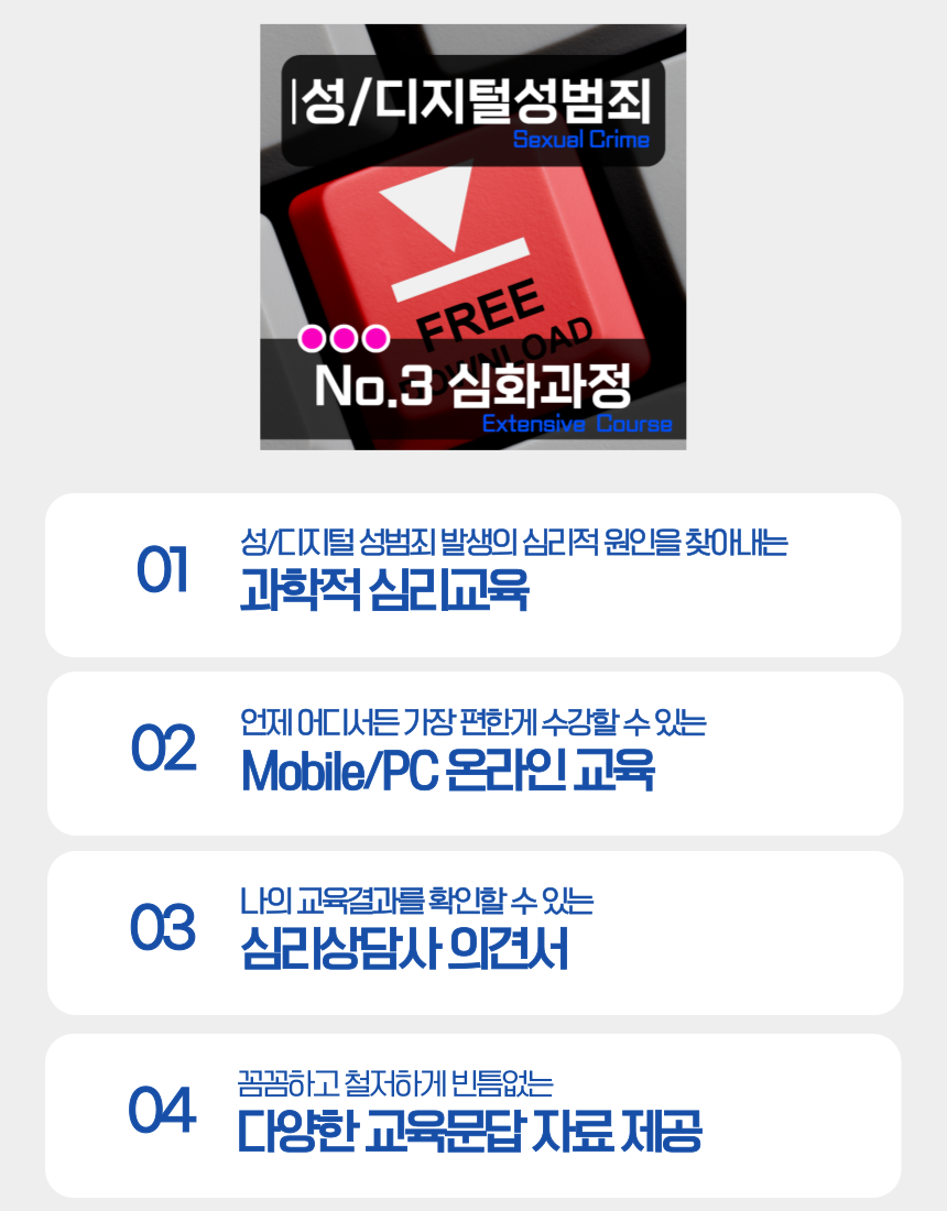 성범죄 재범방지교육 + 준법정신 강화교육 + 자기인식과 반성 교육 수강 후 수료증과 기타 교육문답자료 양식을 제공해 드립니다.