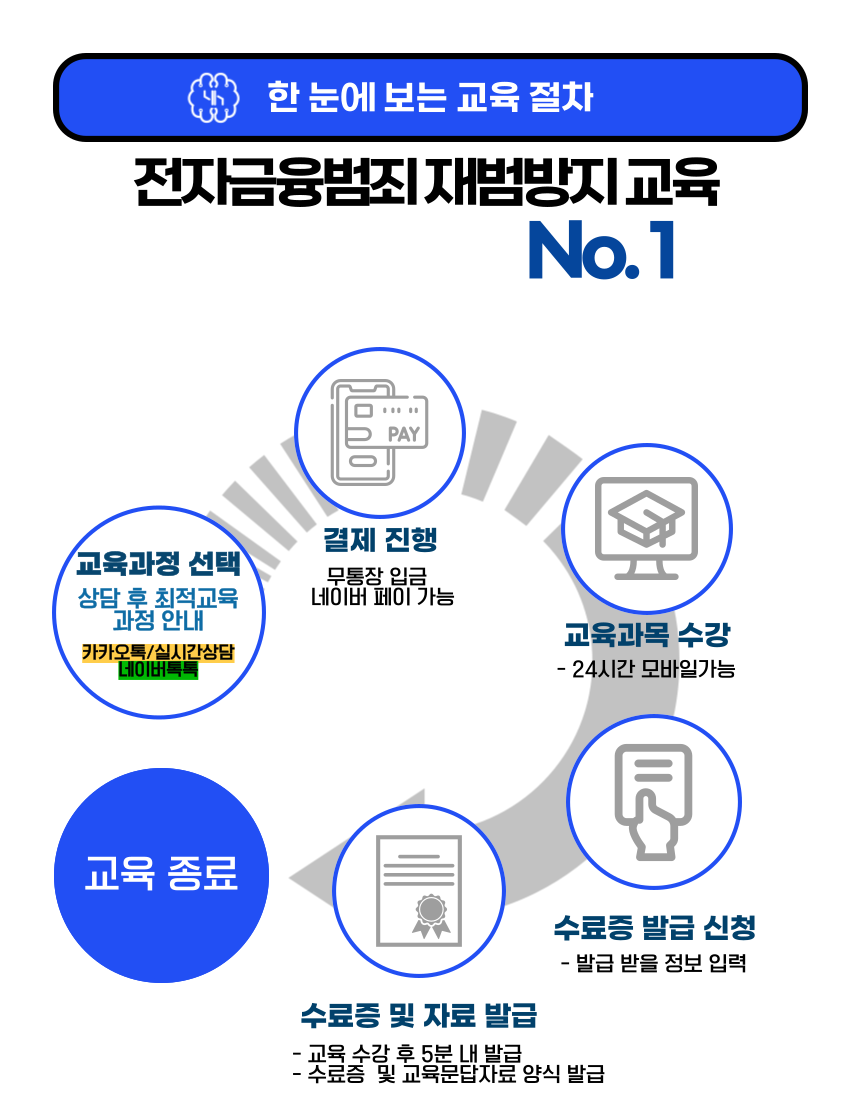 전자금융범죄 재범방지교육 + 준법정신 강화교육 +자기인식과 반성 교육 수강 후 수료증과 기타 교육문답자료 양식을 제공해 드립니다.